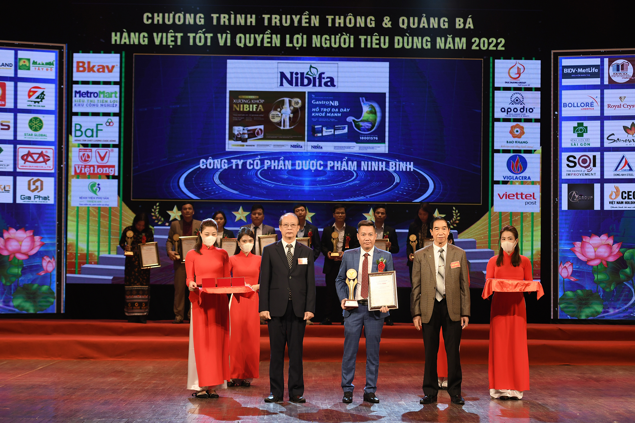 Công ty CP Dược phẩm Ninh Bình (Nibifa) vừa được trao giải thưởng uy tín “Sản phẩm chất lượng vàng vì quyền lợi người tiêu dùng năm 2022” do Viện Kinh tế và Văn hóa kết hợp với Trung tâm Bảo vệ Người tiêu dùng Việt Nam tổ chức ngày 02/04/2022 tại Hà Nội.